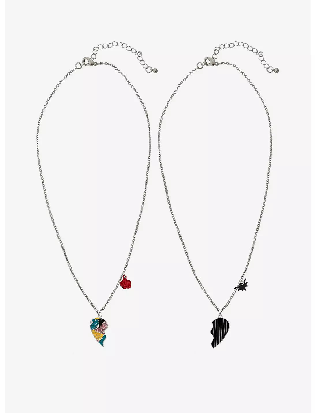 Complétez votre duo avec ce coffret de colliers inspirés de L'Étrange Noël de Monsieur Jack ! Composé de pendentifs demi-cœur à l'effigie de Jack et Sally, ornés de petites roses et chauves-souris, il s'assemble grâce à un aimant. 45,7 cm + rallonge de 7,6 cm