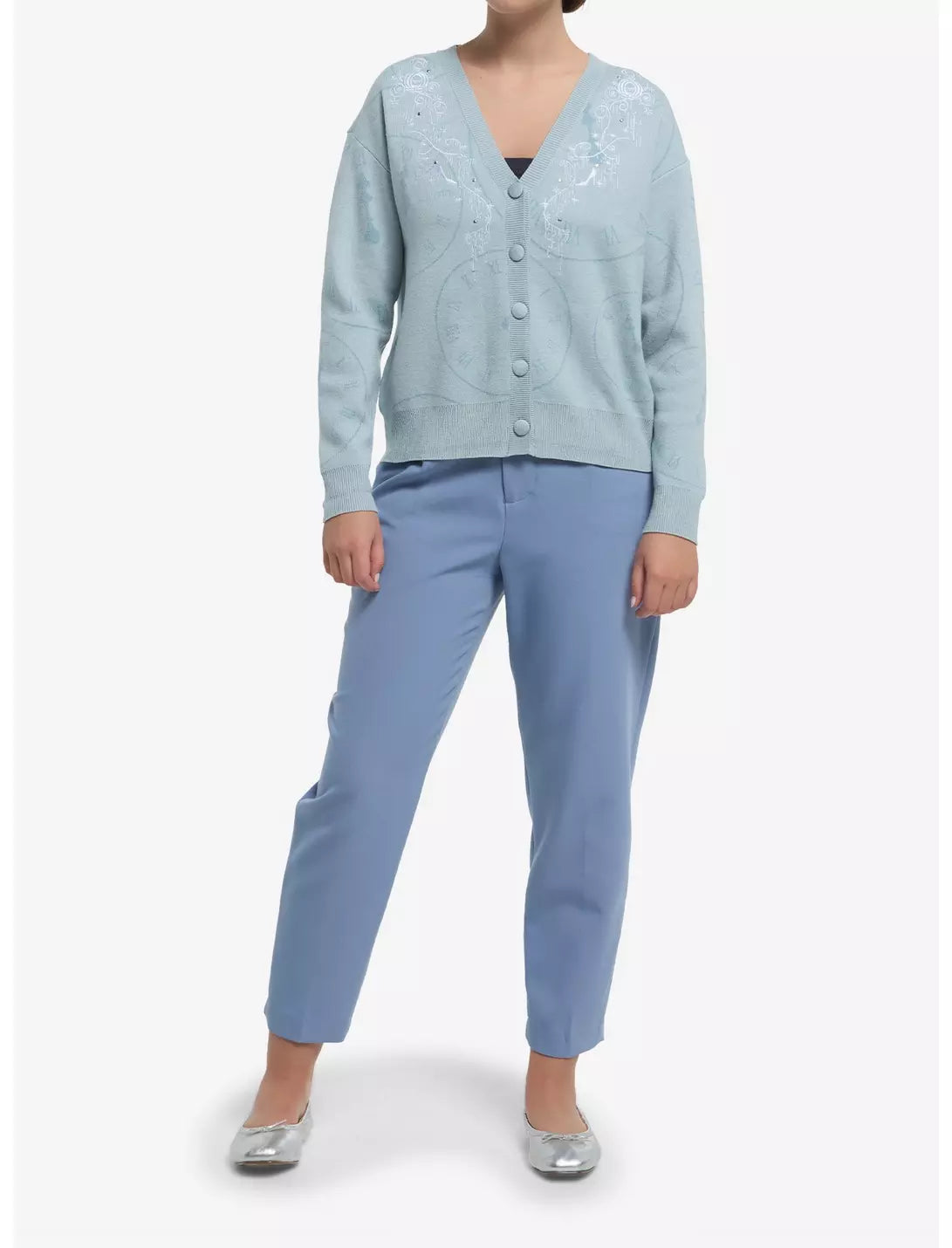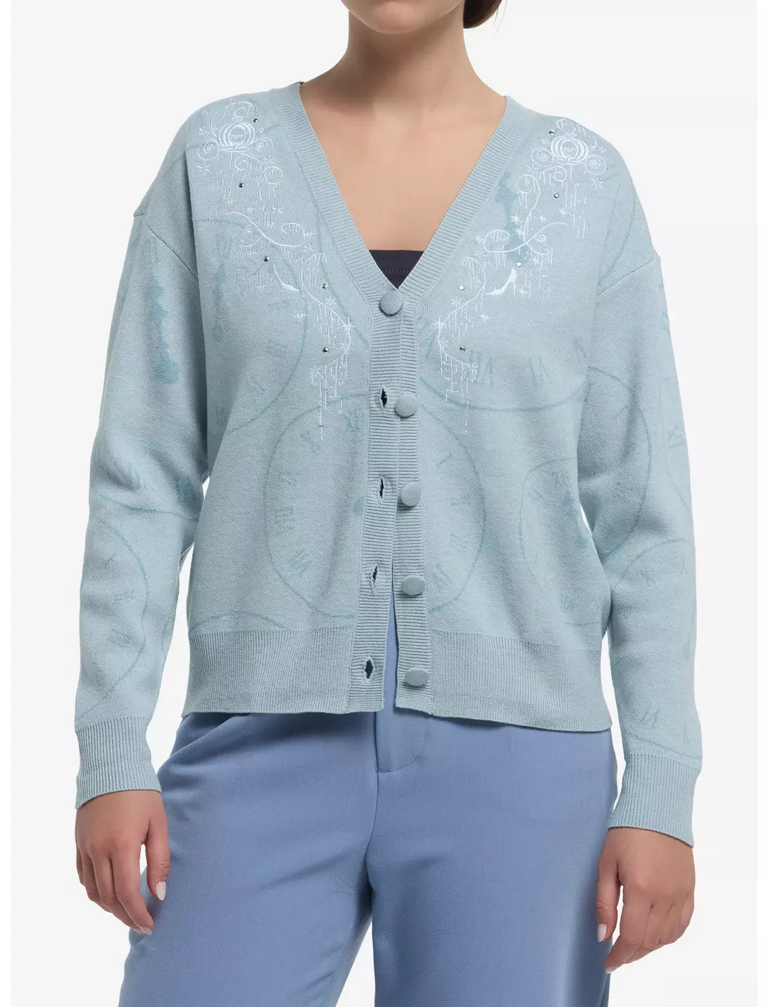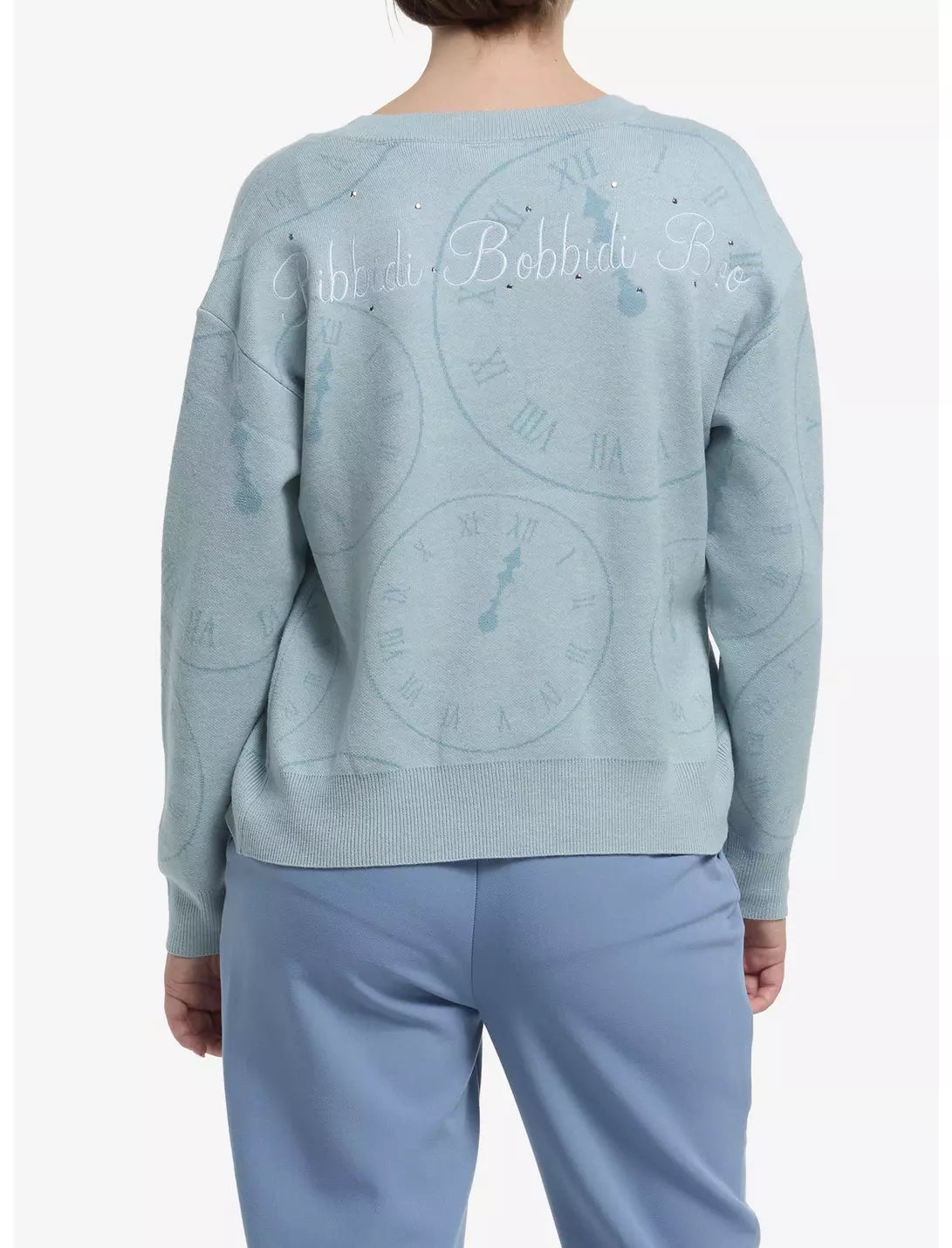 Il est légèrement court et arbore des horloges tricotées sur toute la surface, ainsi que des broderies et des strass sur le devant de l'encolure. « Bibbidi Bobbidi Boo » est brodé dans le dos.