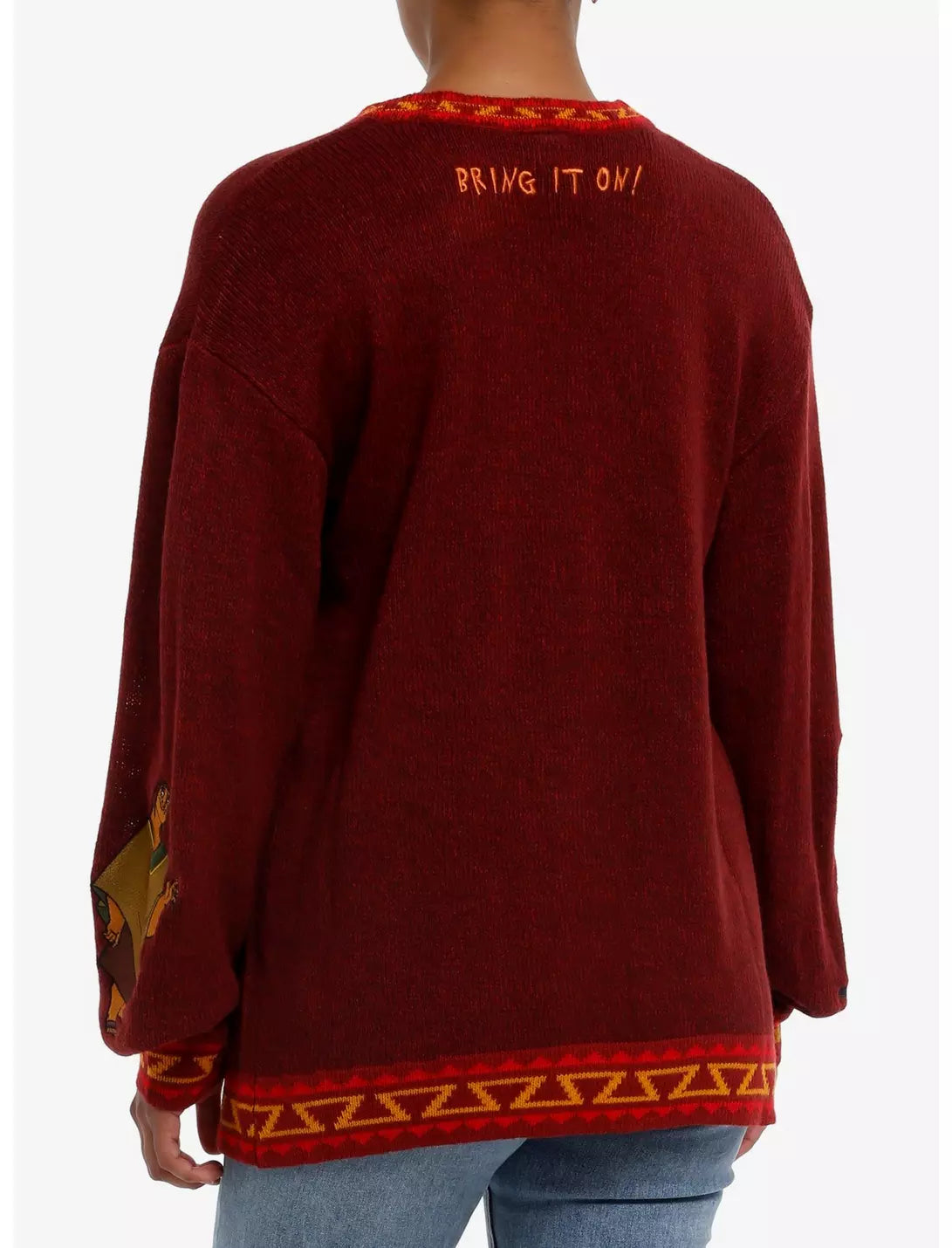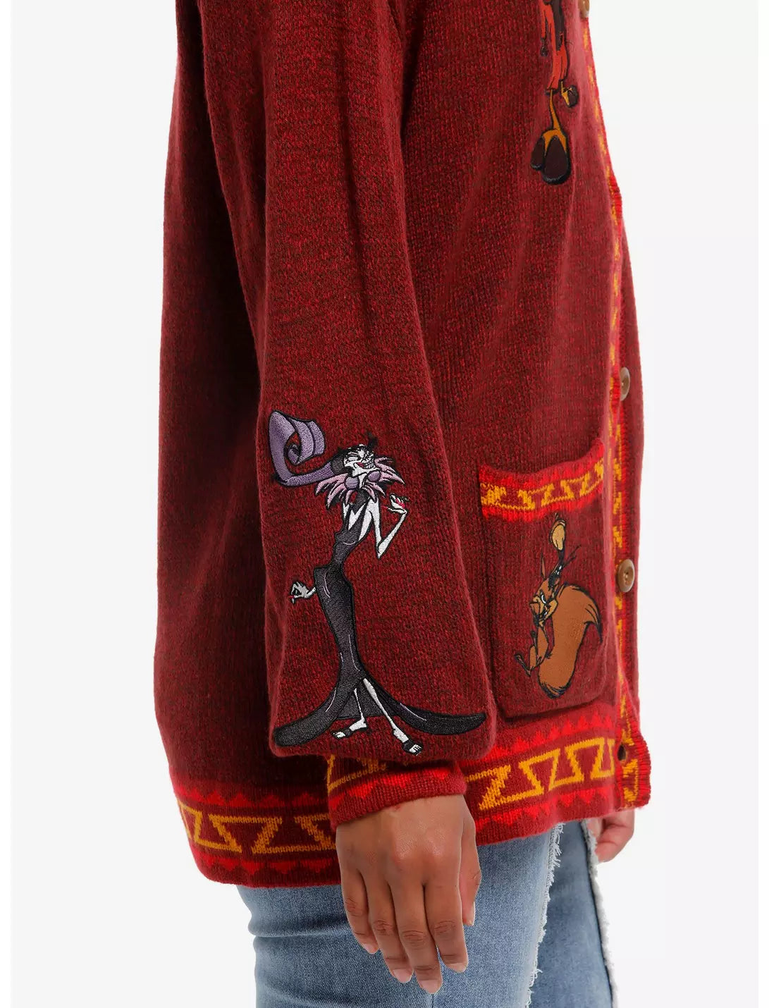 Entrez dans l'ambiance avec ce cardigan en maille de Kuzco, Yzma, Bucky et Pacha, un humain et un lama, brodés sur le devant et les manches. Il est orné de détails géométriques le long des ourlets, des poches avant et de l'inscription « Bring it on ! » brodée au dos.