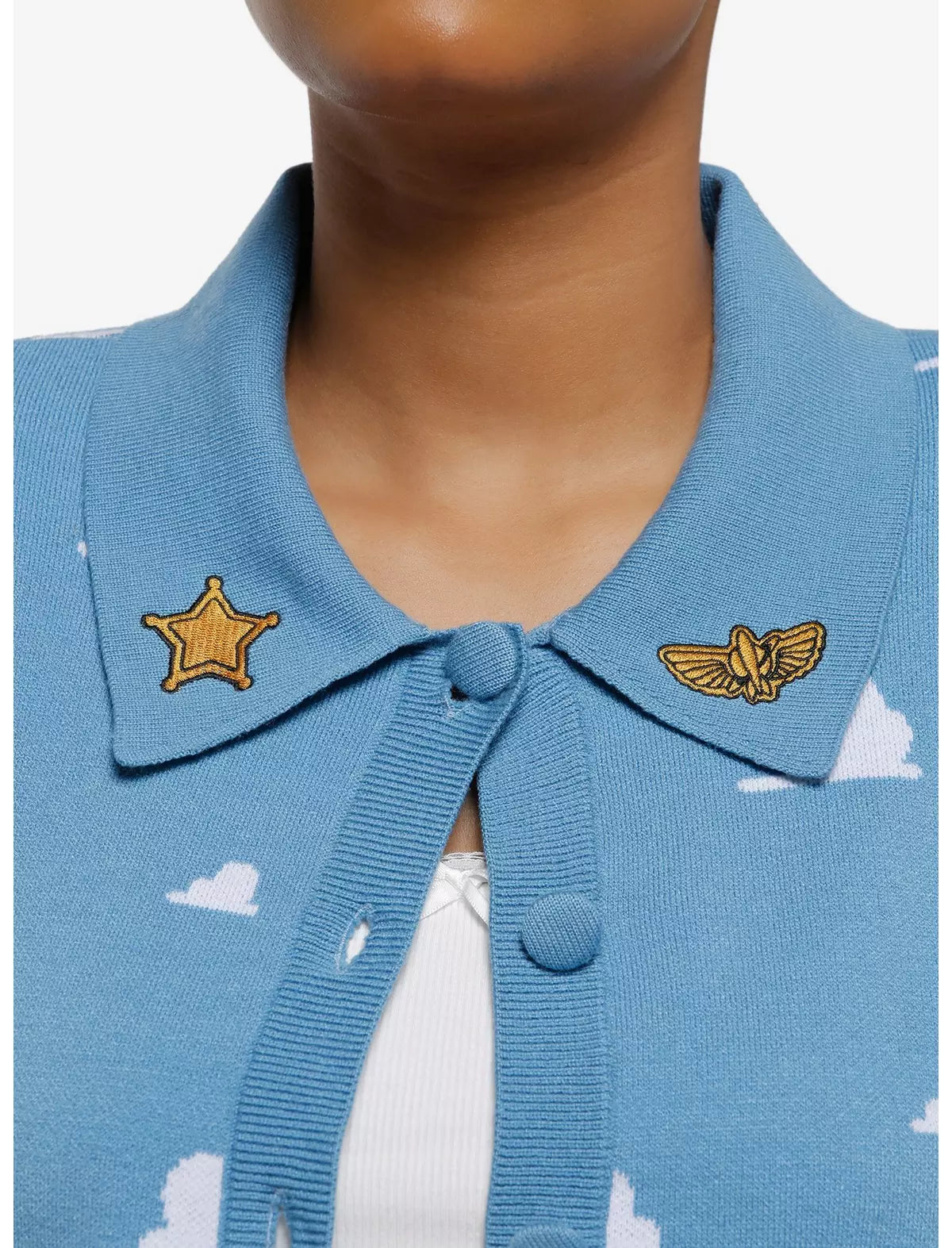 Partez vers l'infini et au-delà avec ce cardigan Toy Story ! Il arbore un motif nuageux inspiré de la chambre d'Andy, ainsi que des broderies de Woody et Buzz s'élançant à l'action et de leurs symboles sur le col. Fermeture boutonnée sur le devant.