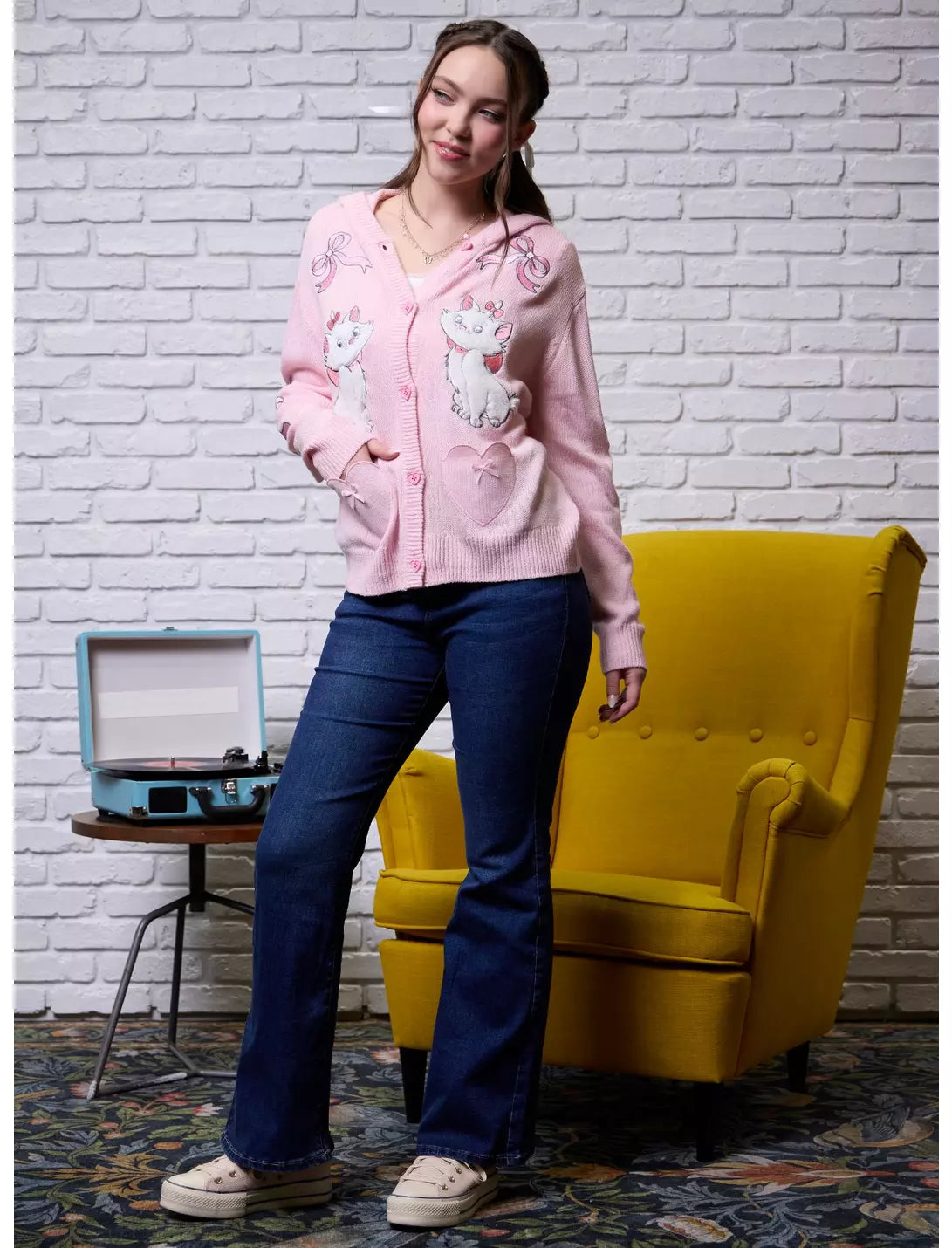 Restez bien au chaud dans les rues de Paris avec ce gilet à capuche inspiré des Aristochats ! Ce gilet en maille est orné de boutons en forme de cœur sur le devant et de poches en forme de cœur avec des détails en ruban.