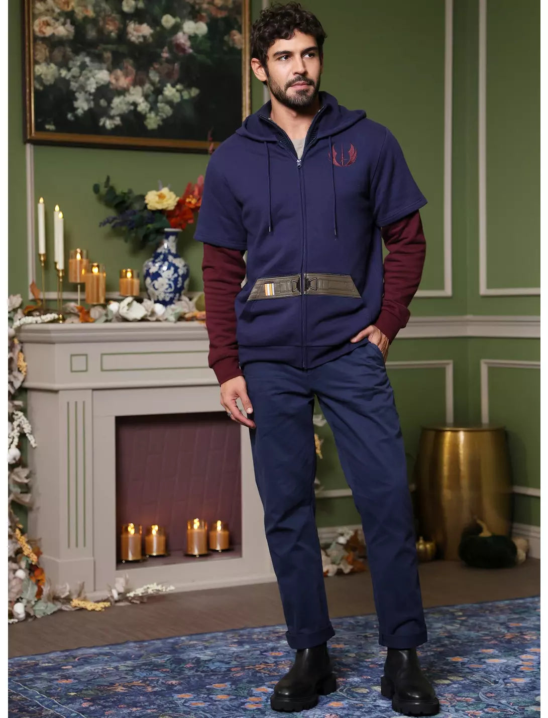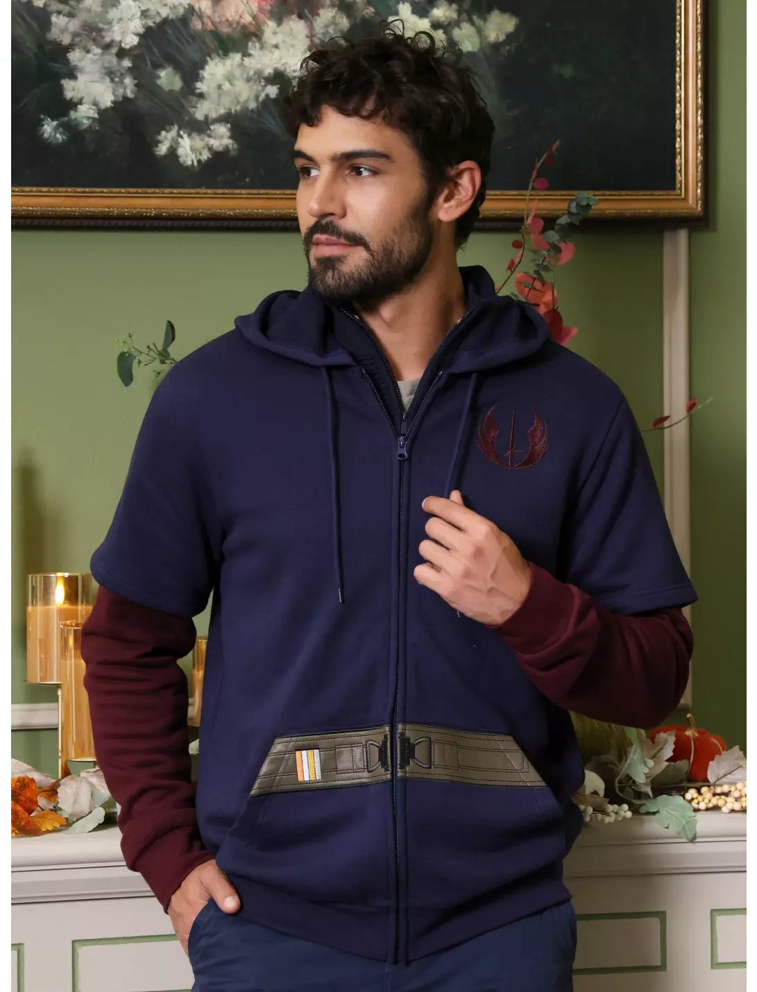 Inspiré de l'armure d'Anakin Skywalker, ce modèle zippé arbore un corps bleu marine et des manches bordeaux. Il est orné de l'emblème Jedi brodé sur la poitrine et de la ceinture d'Anakin sur les poches avant, avec des détails en similicuir.