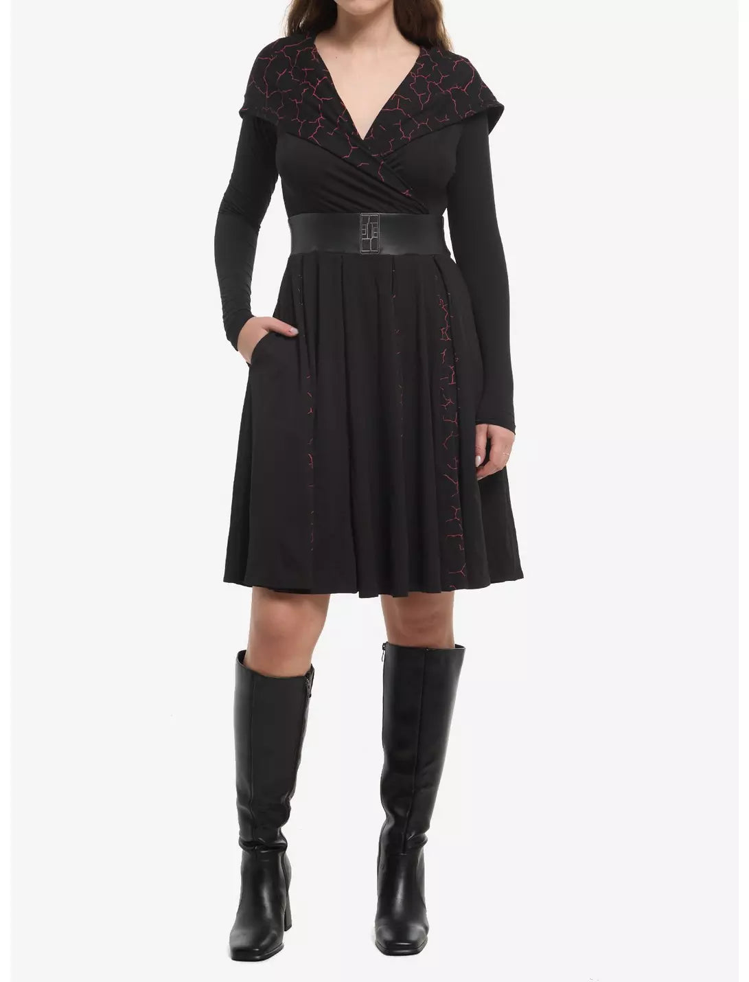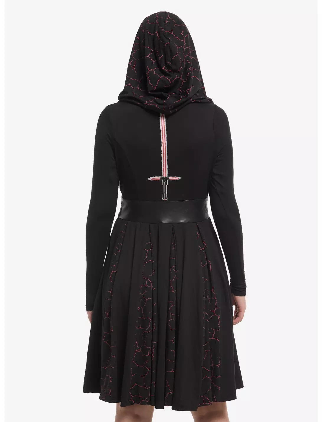 Accomplis enfin ta destinée ! Cette robe Star Wars à manches longues, inspirée de Kylo Ren, est dotée d'une capuche spectaculaire drapée sur les épaules, imprimée d'éclairs rouges.