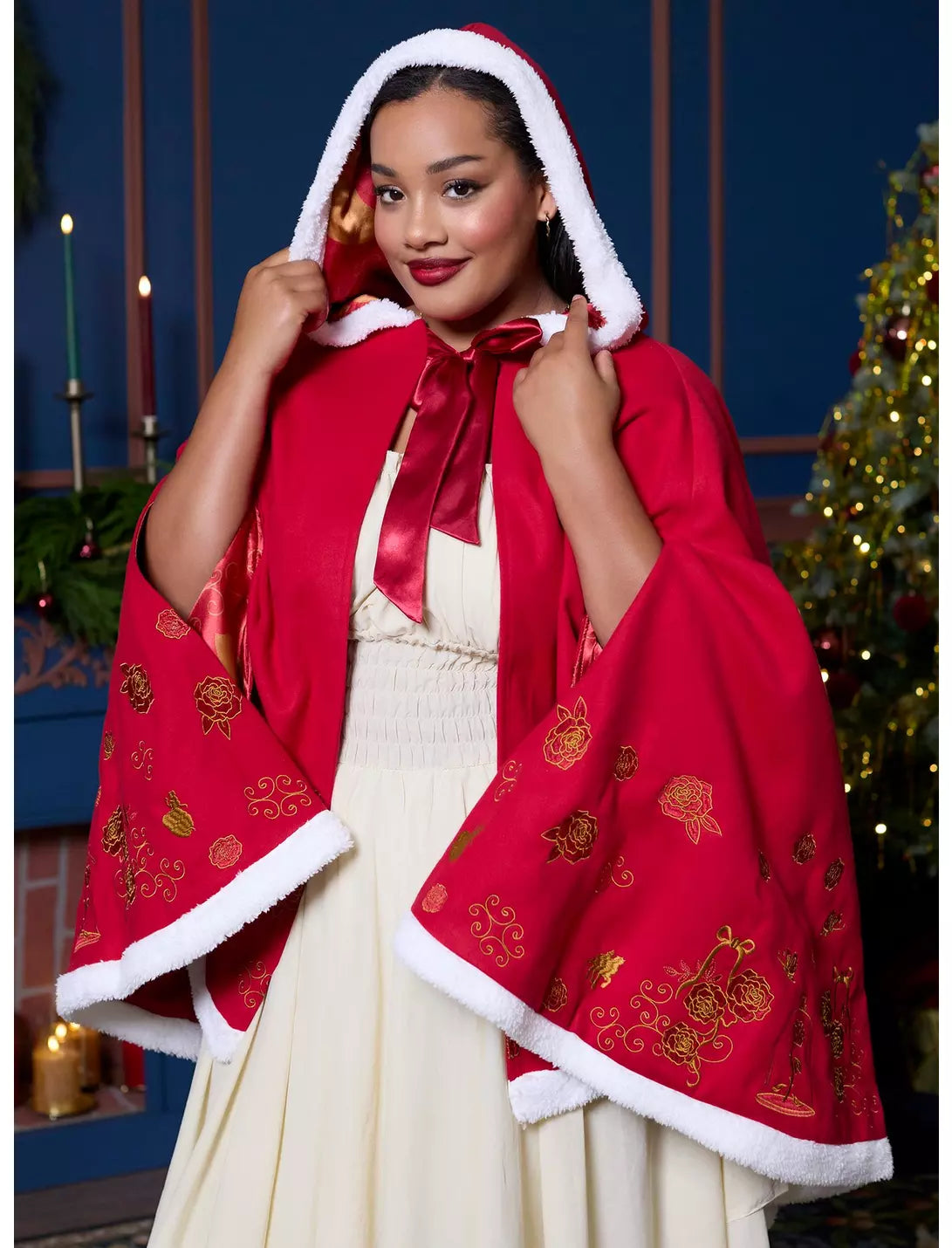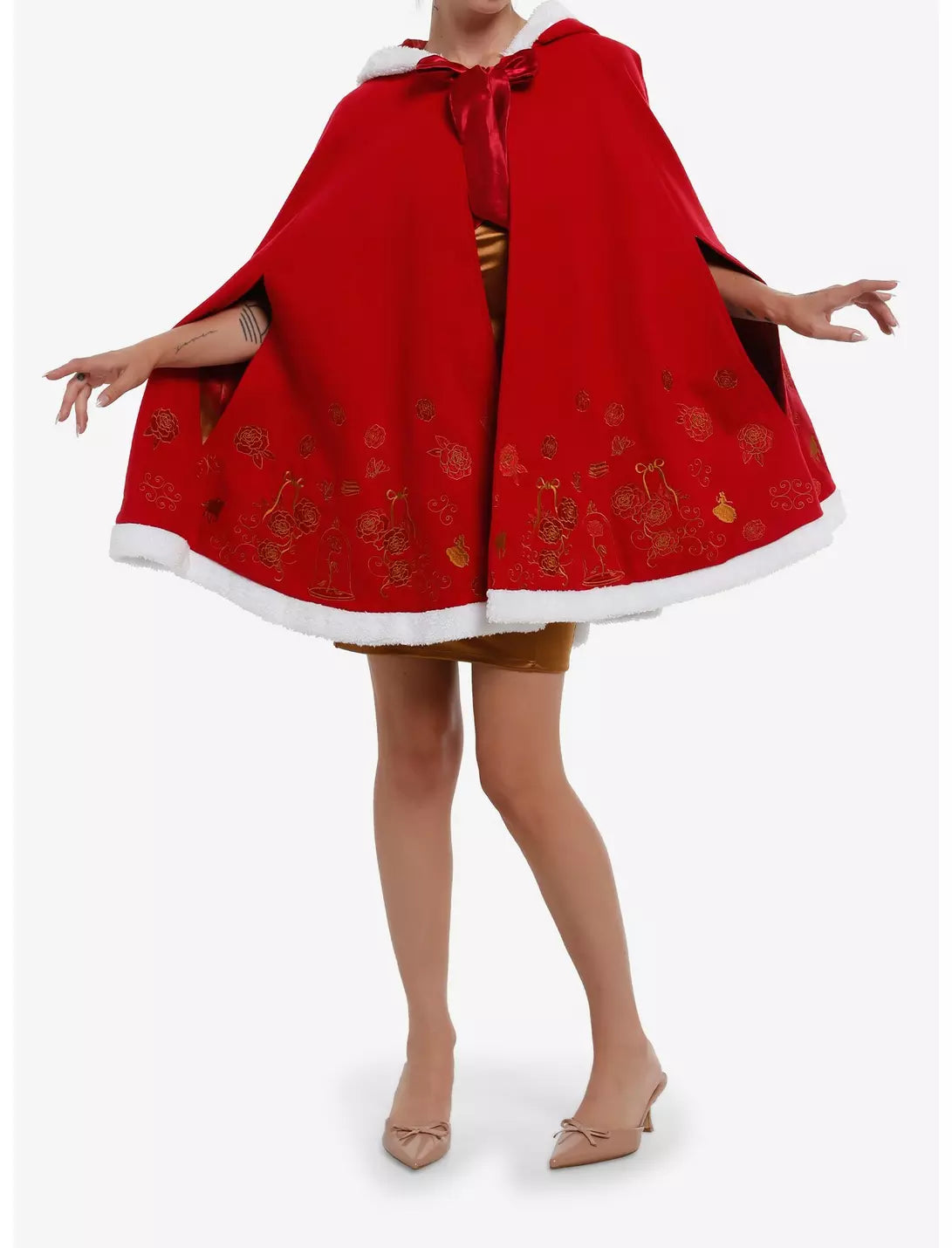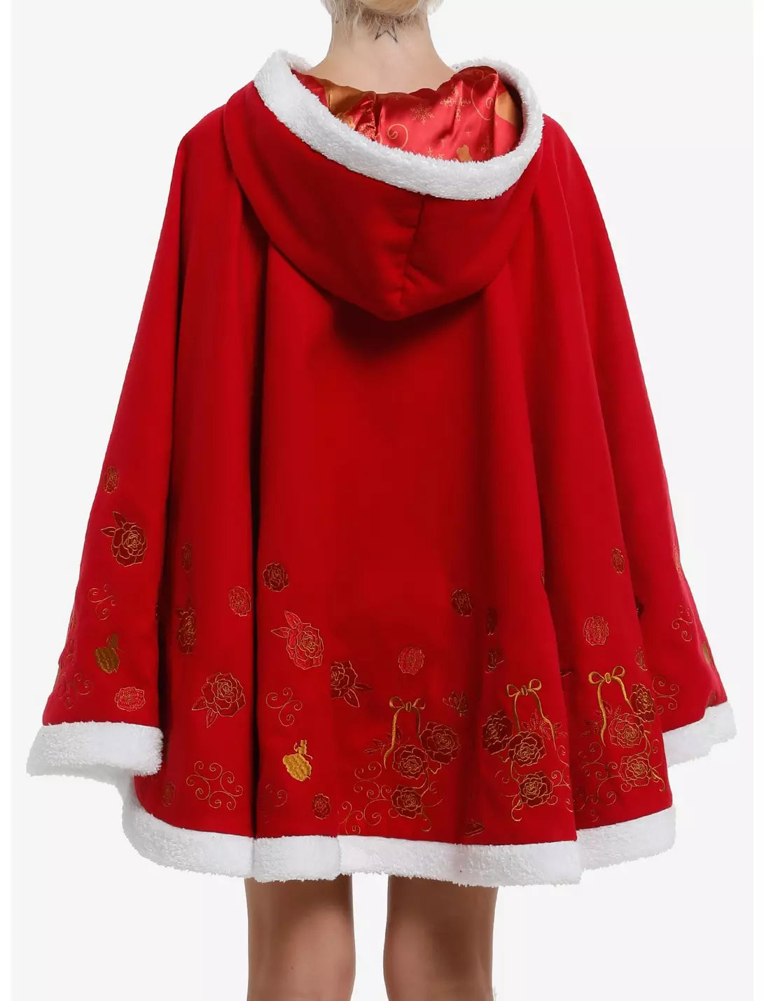 Inspirée du look hivernal de Belle, cette cape est ornée de roses brodées sur le bord.