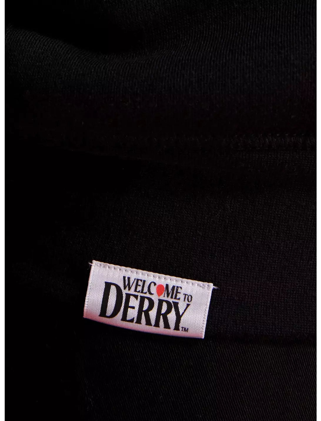 Ce sweat à capuche Ça : Bienvenue à Derry arbore la silhouette menaçante de Grippe-Sou sur le devant, sur fond de forêt rouge, les yeux de Grippe-Sou sur la capuche et l'inscription « Always the eyes » imprimée au dos.