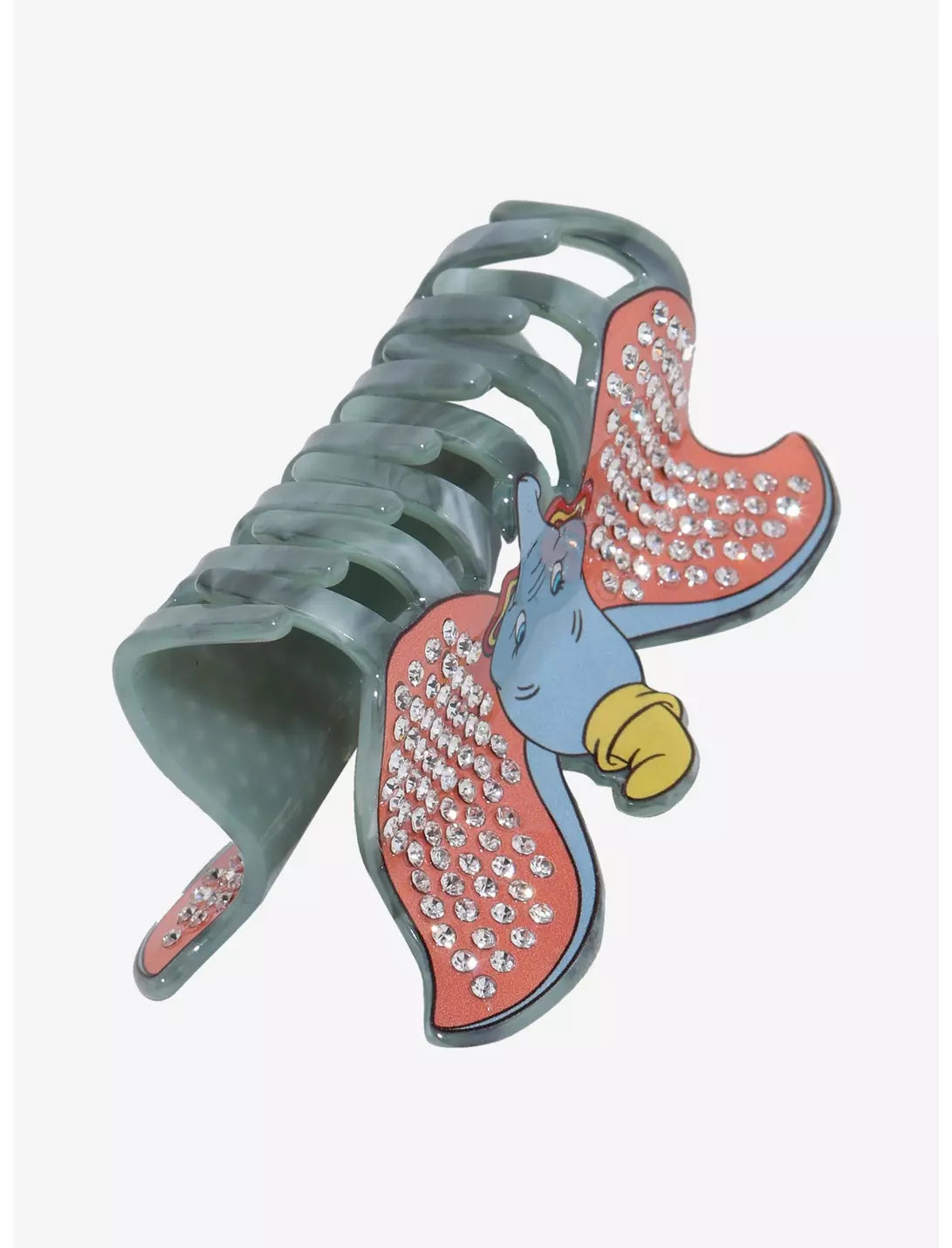 Tout droit venu du paradis, directement pour vous. Cette pince à cheveux en forme de griffe de Dumbo représente l'adorable bébé éléphant dans son costume de cirque, les oreilles déployées et ornées de fausses pierres précieuses transparentes. Acrylique ; plastique
