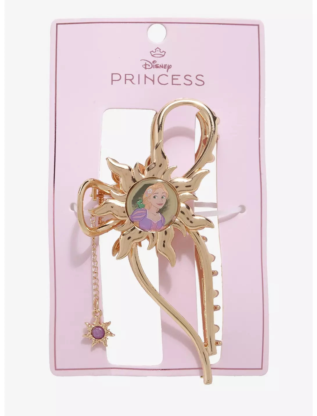 Illuminez votre chevelure avec cette pince à cheveux Raiponce ! Ornée du portrait de Raiponce et d'un pendentif en forme de pierre précieuse, cette barrette dorée s'adapte facilement aux cheveux les plus épais.