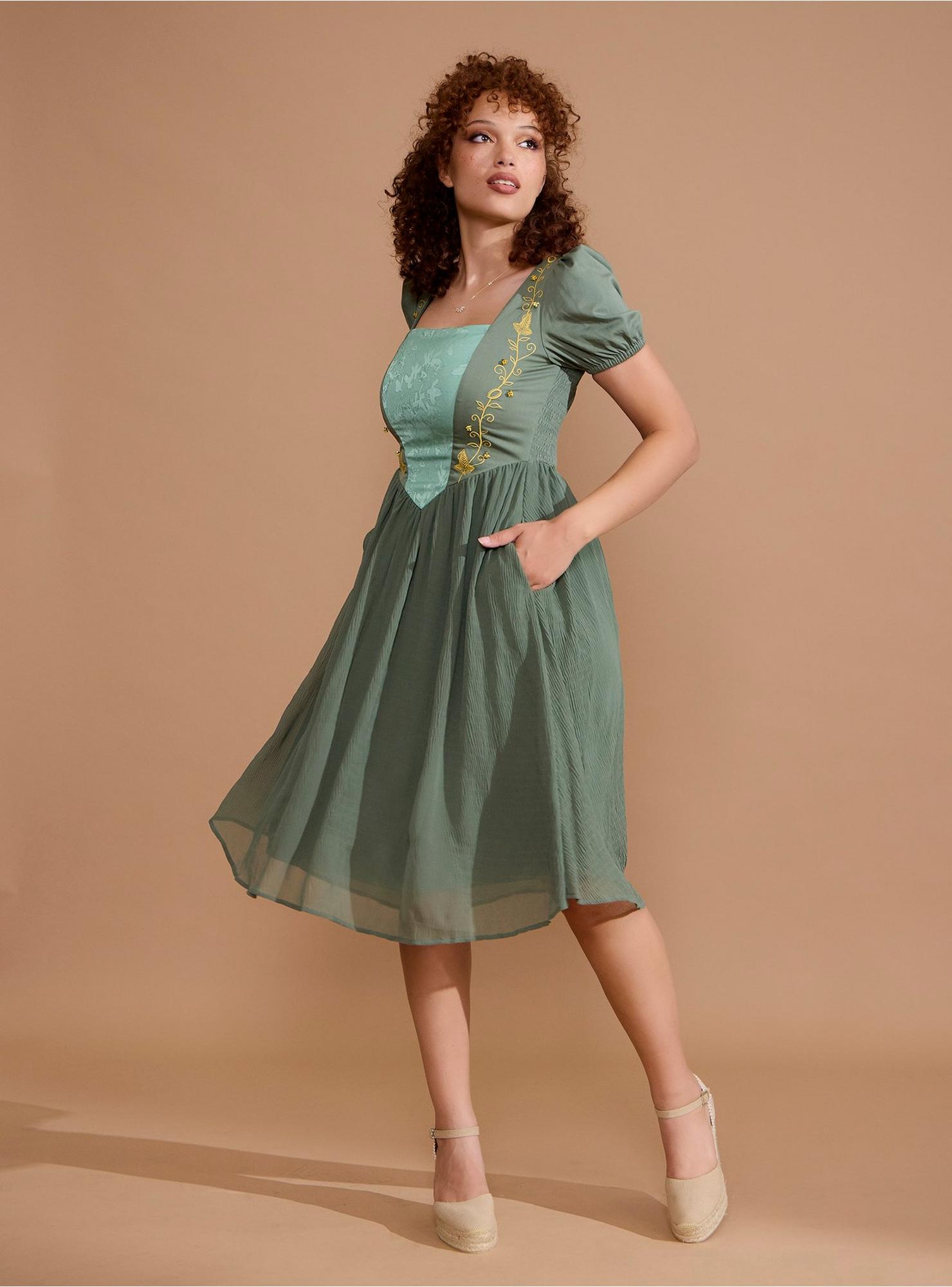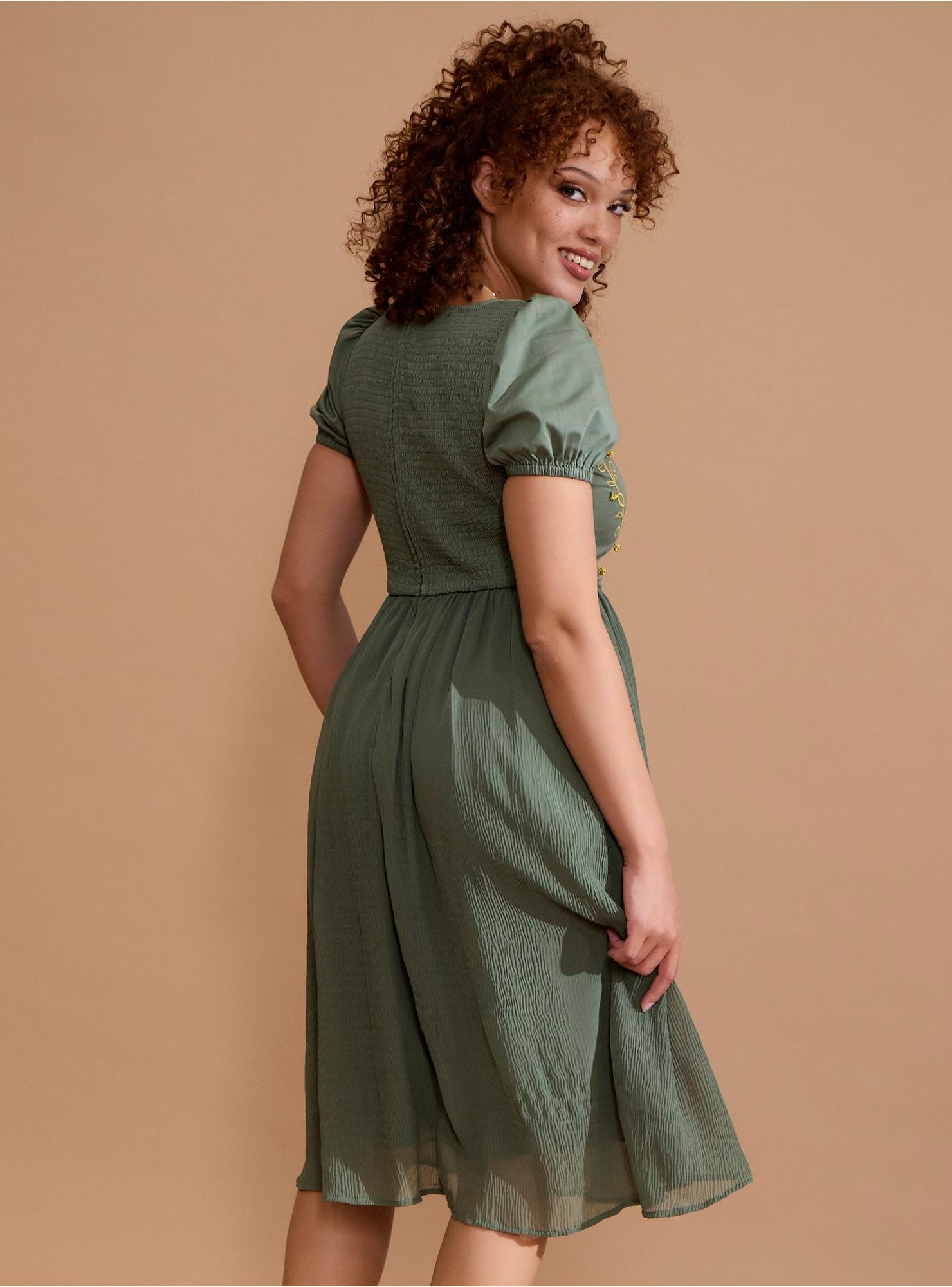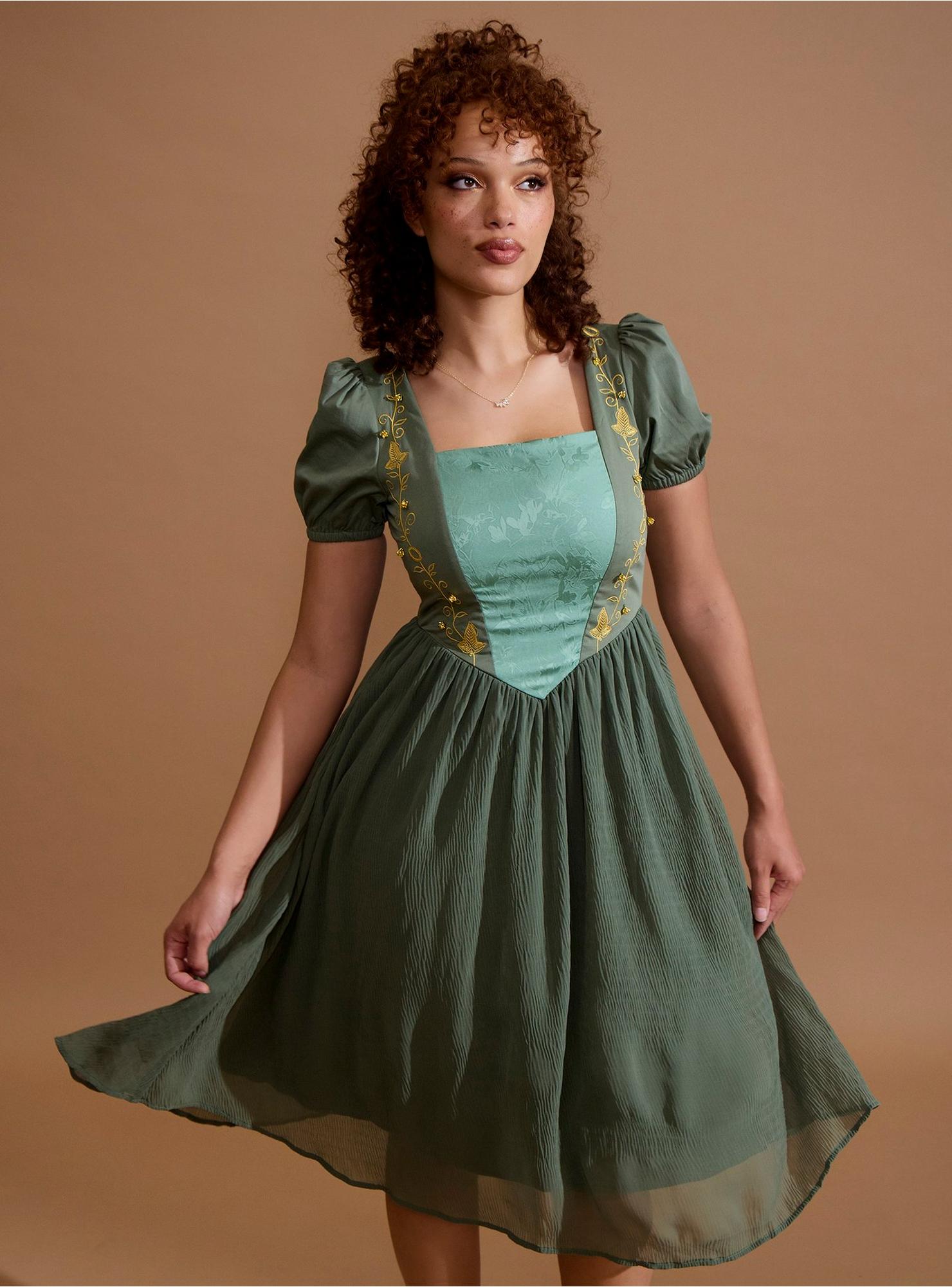 Besoin de quelque chose à porter pour la fête du 111e anniversaire de Bilbo ? Nous avons juste la chose ! Tournez autour de la piste de danse dans cette robe du Seigneur des Anneaux ! Avec un corsage de style corset avec un panneau central à imprimé floral sauge, tandis que les côtés sont brodés de filigrane, de l'Anneau Unique et de feuilles de Lórien. Livré avec des ornements de fleurs en 3D. Conçu avec une jupe en mousseline de soie froissée, des manches bouffantes et un dos fumant. Complet avec des poches et une fermeture à glissière arrière.