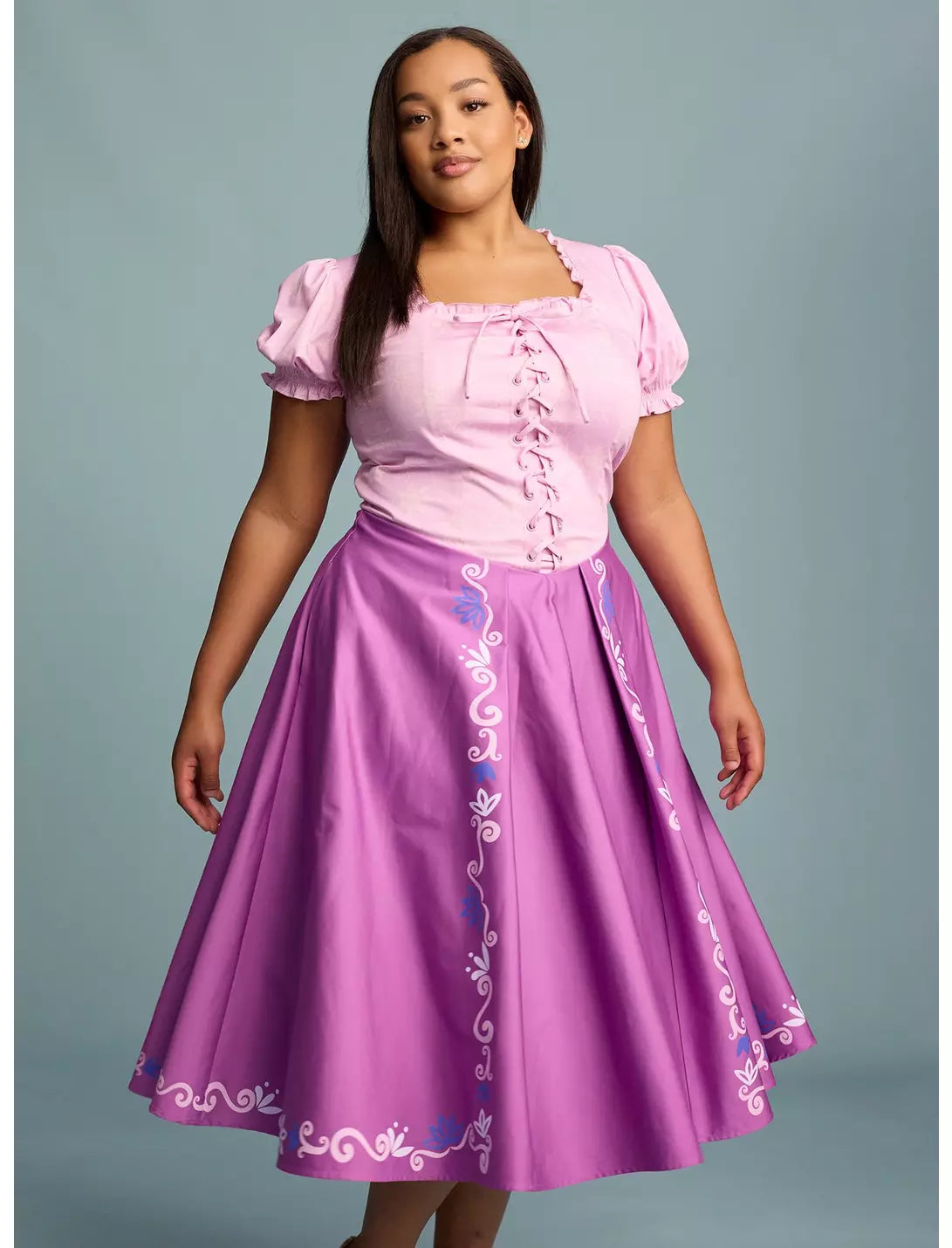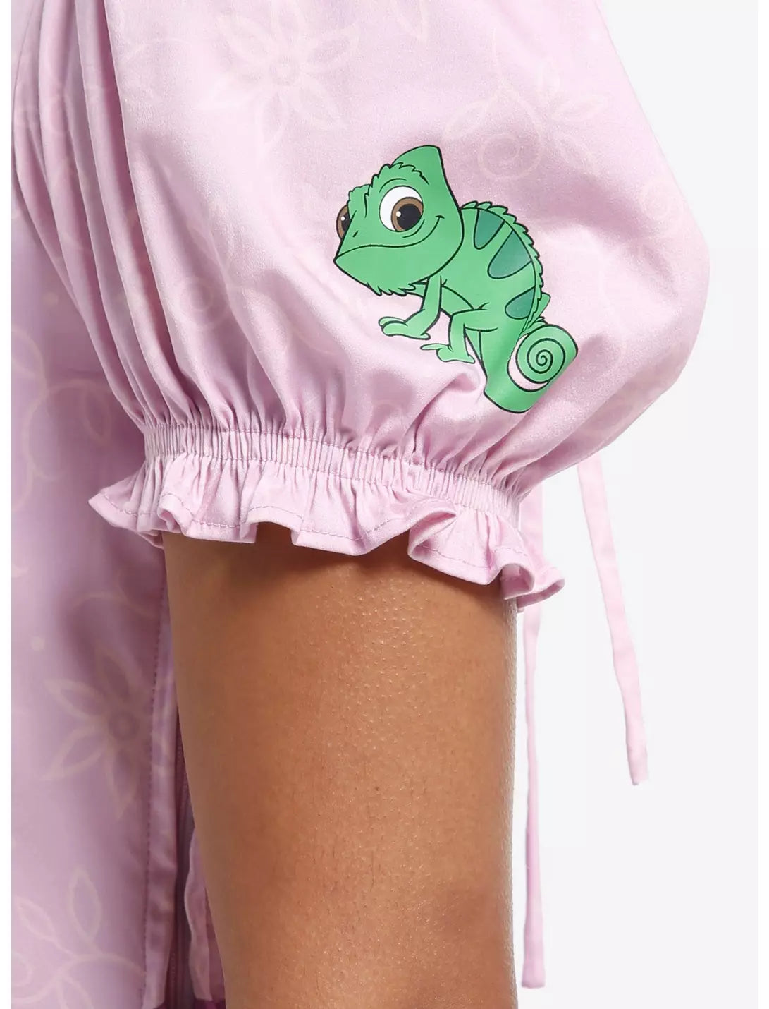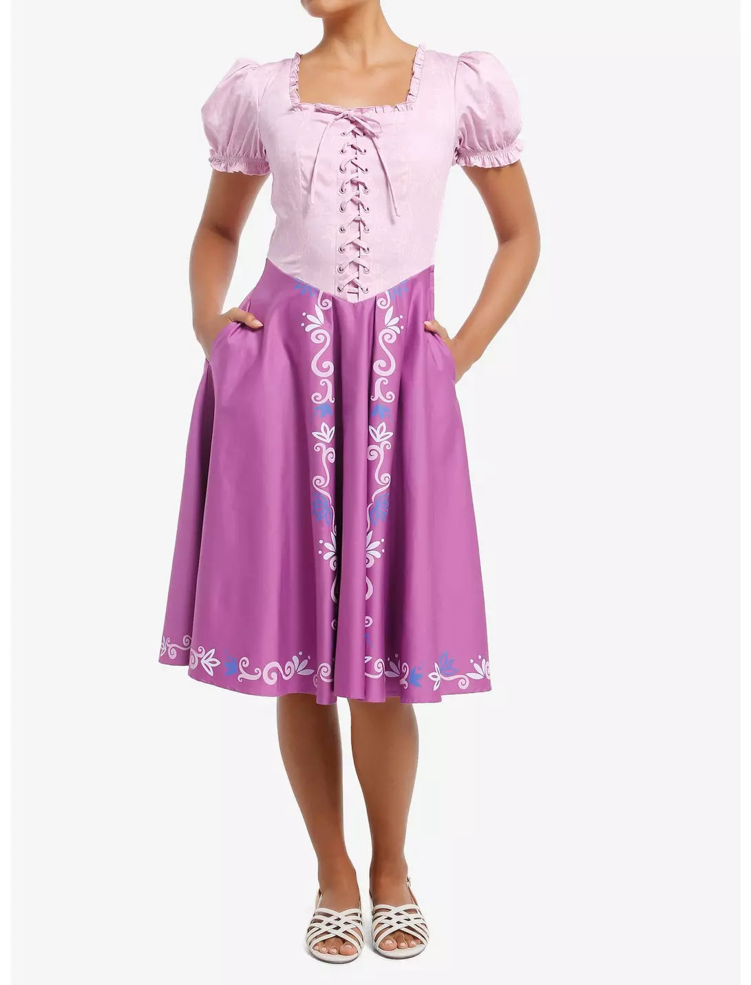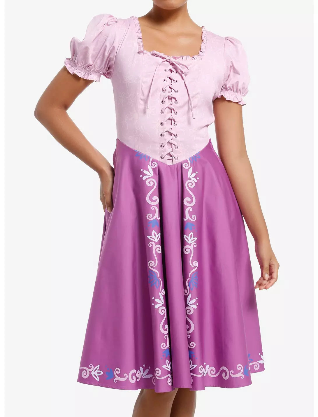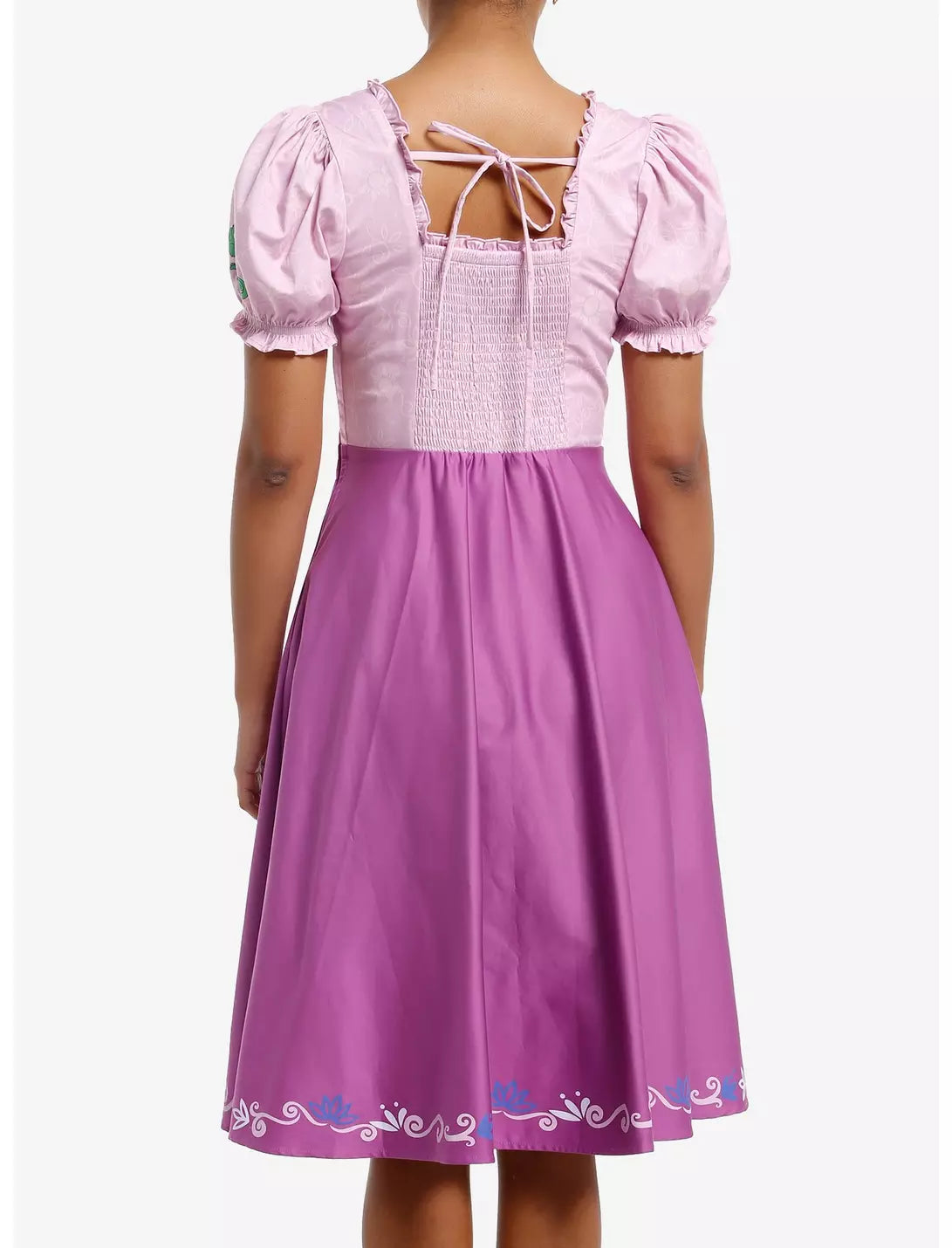 Cette robe Raiponce est inspirée de celle du film, avec un laçage au niveau de la poitrine, des détails en filigrane sur la jupe et des volants le long de l'encolure carrée.