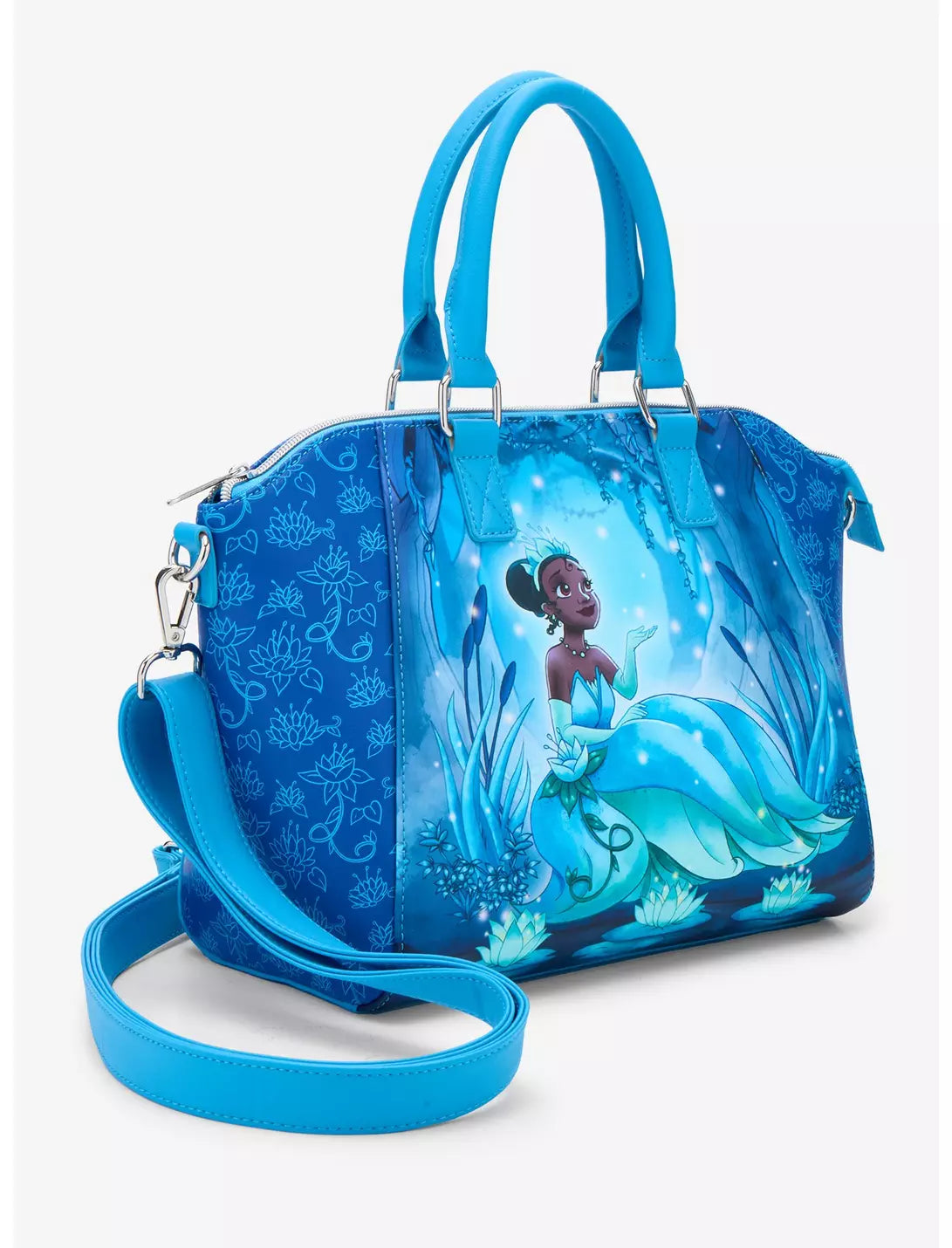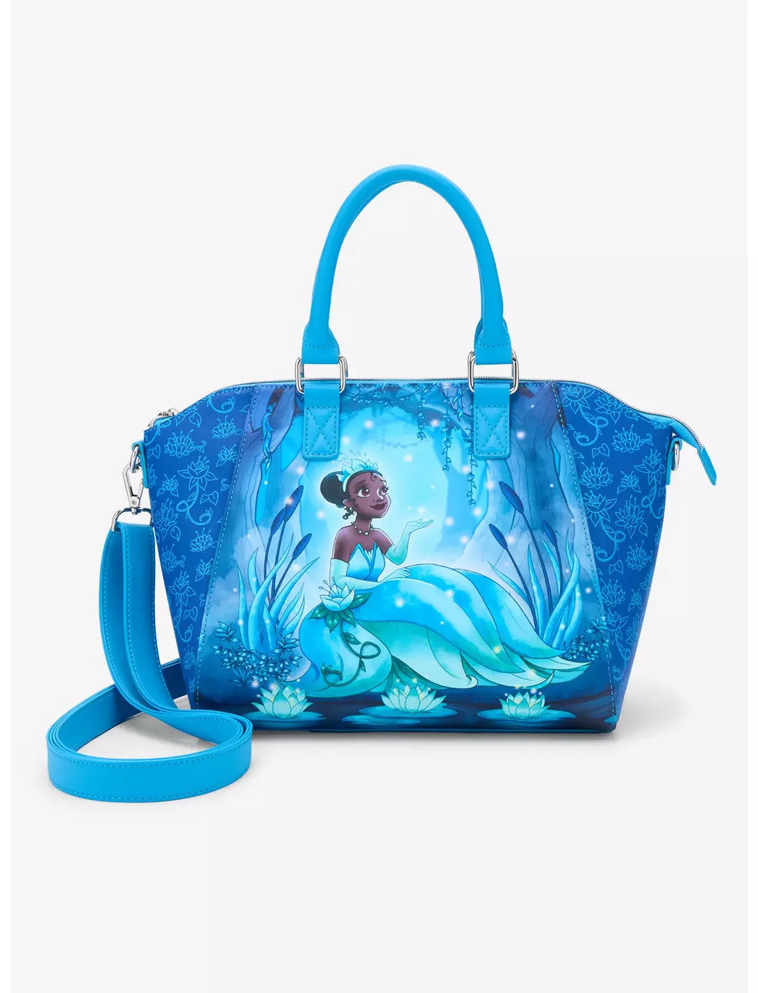 Partez à l'aventure dans le bayou avec tous vos indispensables dans ce sac à main La Princesse et la Grenouille ! Il est orné de panneaux floraux bleus et met en scène Tiana dans sa robe de princesse, entourée de nénuphars et de lucioles. Il est doté d'une bandoulière ajustable et amovible, d'une poche intérieure, de poignées et d'une fermeture éclair sur le dessus.
