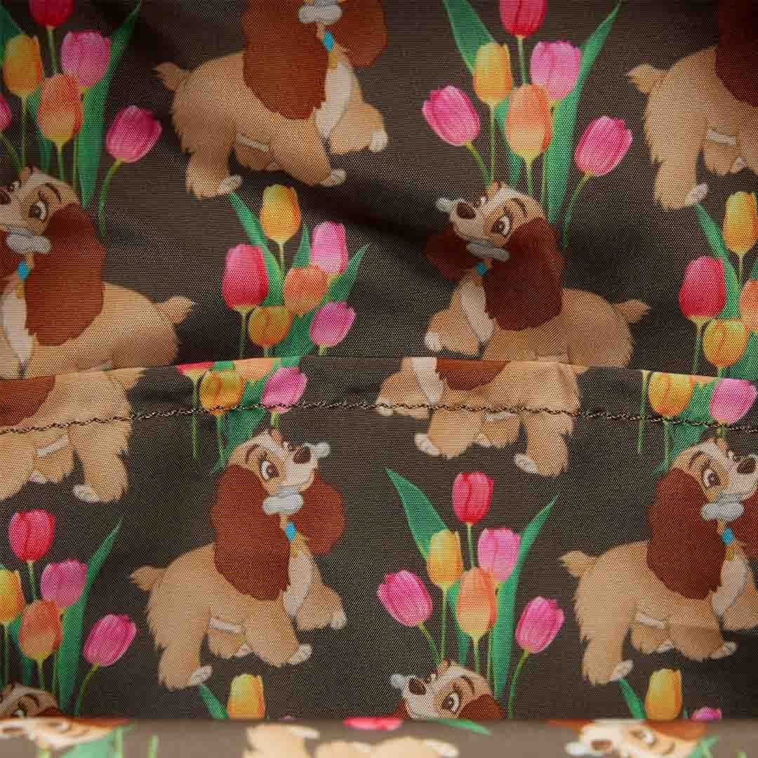 Ce mini sac à dos met en scène Lady, le personnage du film Disney « La Belle et le Clochard » . On la retrouve sur la poche avant, un os dans la gueule, se promenant dans un champ de tulipes. À l'arrière, sa niche est ornée de l'inscription « Lady ». Les détails brodés font ressortir les illustrations.
